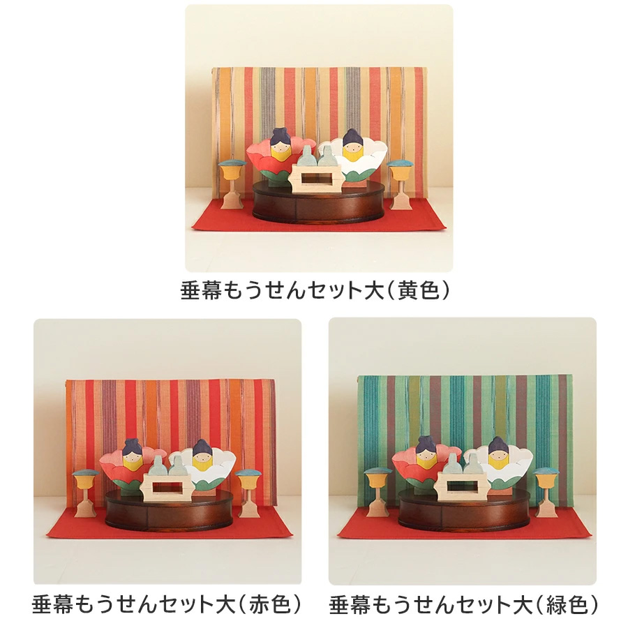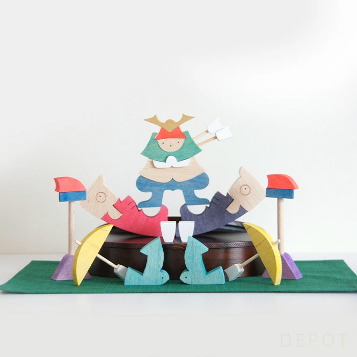 椿の花の形を人形に見立てて、女雛・男雛を紅椿・白椿とし、雪洞や三方徳利と組みました。 ![]() 雪洞や三方徳利が添えられ、春の華やぎと優雅さを感じさせます。 ![]() 容器には木曽檜の曲げわっぱを使用し、漆塗りで丁寧に仕上げました。小ぶりながらも、日本の伝統美と職人技が詰まった逸品です。 ![]() 24片と丸棒2本からなり、木片のレイアウトの仕方によって、さまざまな飾り方が考えられます。 ![]() 飾るという構成遊びと、曲げわっぱの中に木片を組んで片付けるパズル遊び。 それらが子どもの節句を迎える楽しい遊びになります。 ![]() 別売りのもうせんと合わせるととても素敵です。 ※もうせんは別売りです。 このページで使用しているもうせんはLサイズです。 Lサイズはコチラ>> 垂幕もうせんセットと合わせるとより豪華に ![]() 垂幕もうせんセット サイズ大 色赤・黄・緑からお選びいただけます。 ・垂幕もうせんセット(大)はこちらから 楕円鯉武者とおそろい ![]() 同シリーズの「楕円鯉武者(KK223)」と同じ器を採用しており、男児・女児どちらの節句にもお揃いで飾っていただけます。 ・ 楕円鯉武者 はこちらから 商品について