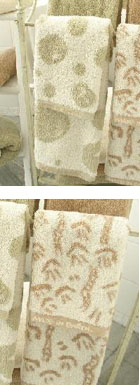 こちらのバスタオルの柄は、みずたまとヤシの2種類。オーガニックコットンならではの肌ざわりがなんともいえません。タオルのヘムの部分には、オーガニックコットンのししゅう糸でマークが入っています。