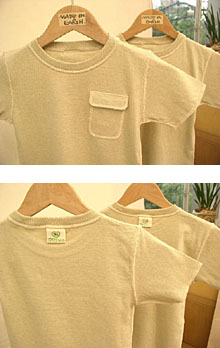 染色ではない、自然の色がやさしいTシャツ。胸についた小さなポケットがかわいいアクセントになっています。親子でお揃いにしても・・・。