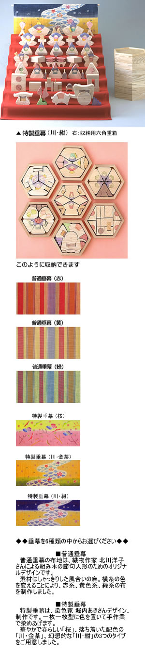 各段ごとに六角形容器に収納されます。円びな同様、飾ること、片付けることが遊びになるお雛さまです。