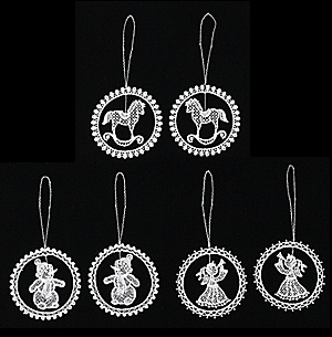 シンプルで美しいレースオーナメントのセットです。木馬、スノーマン、天使の3種類。各2ケセットになっています。
